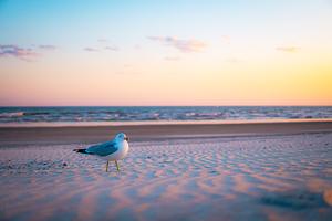 A landscape shot of a seagull on the beach